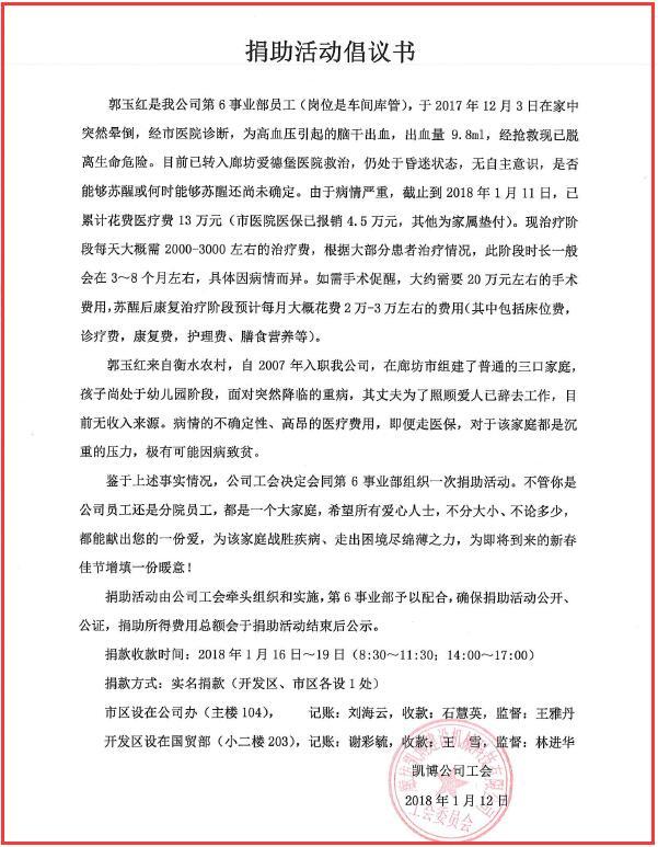 一方有難,八方支援。我公司第六事業部員工郭玉紅(崗位是車間庫管)于2017年12月3日在家中突然暈倒,經市醫院診斷,為高血壓引起的腦干出血,經搶救現已脫離生命危險,目前已轉入廊坊愛德堡醫院救治,仍處于昏迷狀態,無自主意識,是否能夠蘇醒或何時能夠蘇醒還無法判斷。郭玉紅來自衡水農村,自2007年入職我公司,在廊坊市組建了普通的三口家庭,孩子尚處于幼兒園階段,面對突然降臨的重病,其丈夫為了照顧愛人已辭去工作,目前無收入來源。不論經濟層面還是精神層面,病情的不確定性、高昂的醫療費用,對于該家庭都是極其沉重的壓力,極有可能因病致貧。